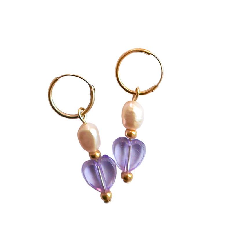 Stainless steel oorringen met parels met lila glaskralen in hartvorm